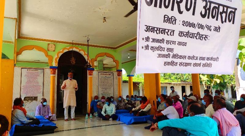 कार्तिक १६ गते एक महिना बढी धर्नामा बस्दा समेत माग पुरा नगरेपछि धनुषाको रमदैयास्थित मेडिकल कलेज शिक्षण अस्पतालका कर्मचारी आमरण अन..