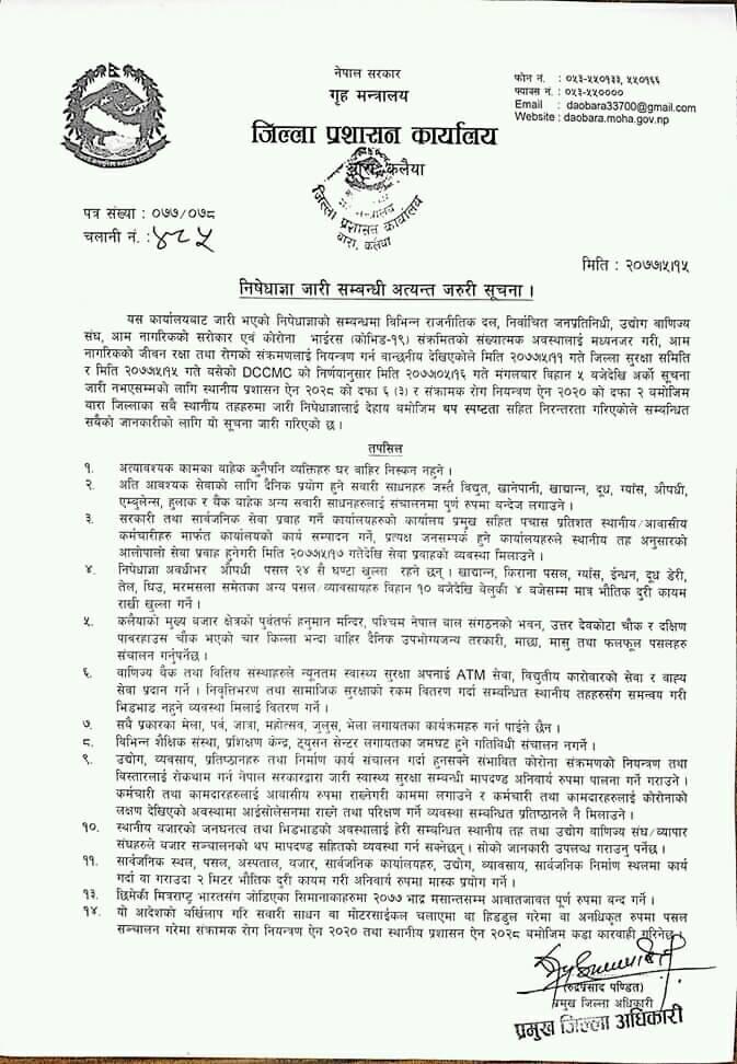 बारा ,भदौँ १६ बारामा आजबाट निषेधाज्ञा खुकुलो हुने भएको छ ।जिल्ला सुरक्षा समिति र डिसिसिएमसीको बैठकले आज बिहान ५ बजेदेखि अर्को सूचन..